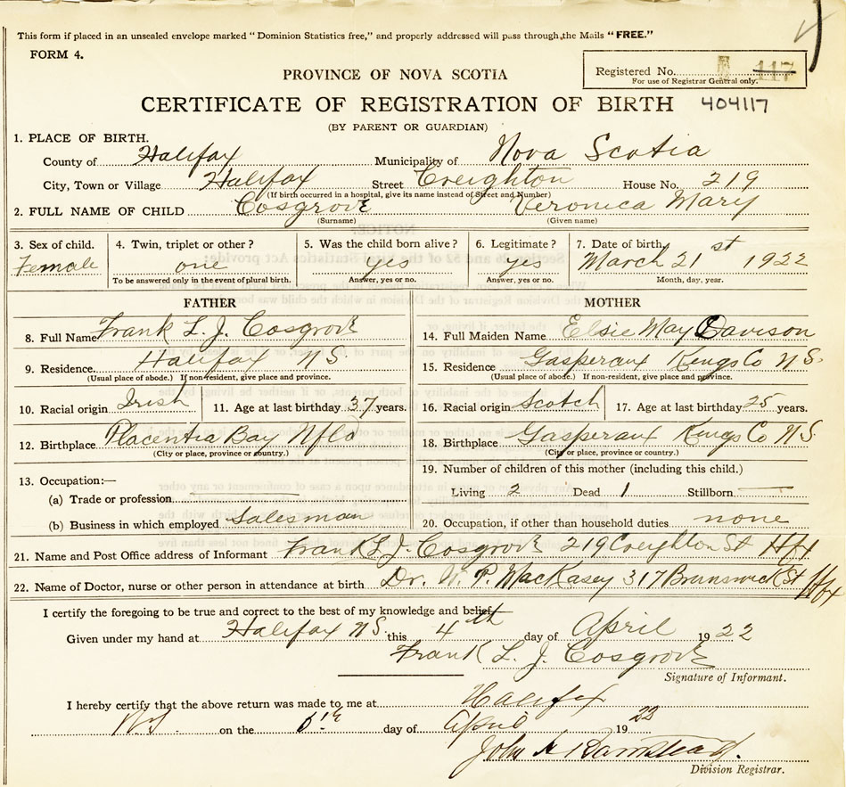 21. Name and Post Office address of Informant Frank L.J. Cosgrove 219 Compton St., Halifax