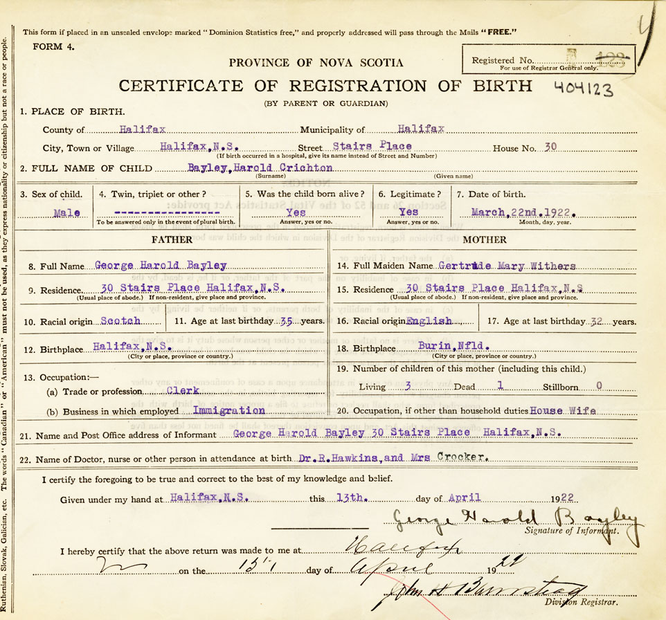 21. Name and Post Office address of Informant George Harold Bayley 30 Stairs Place, Halifax