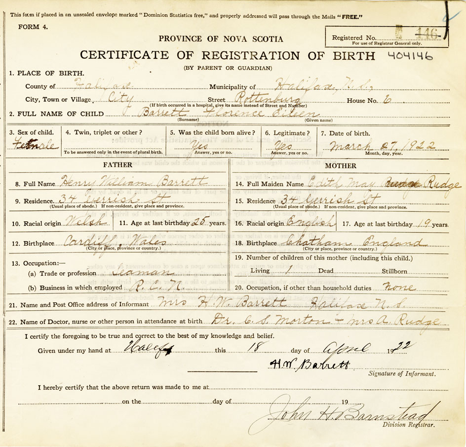 21. Name and Post Office address of Informant Mrs. H. W. Barrett Halifax