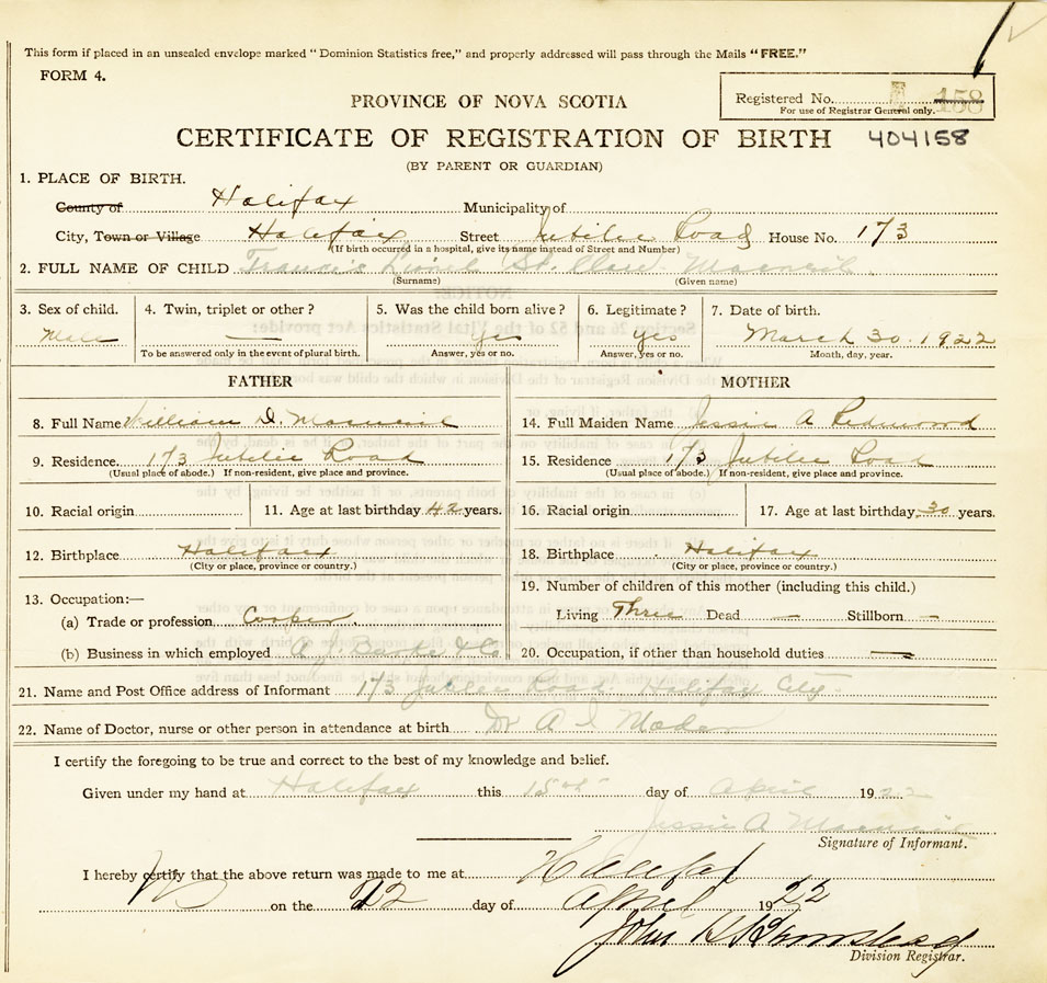21. Name and Post Office address of Informant Jessie A. MacNeil 173 Jubilee Road, Halifax City