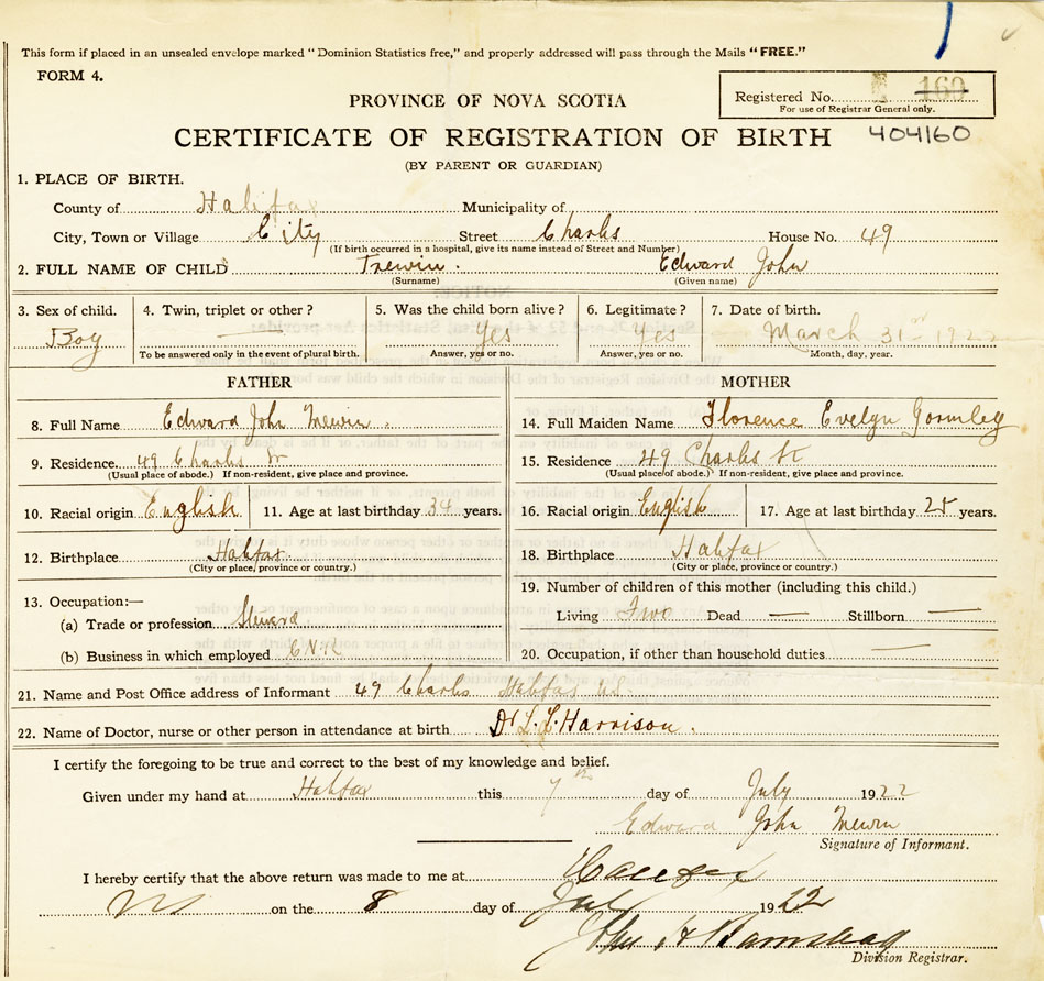 21. Name and Post Office address of Informant Edward John Trewin 47 Charles, Halifax