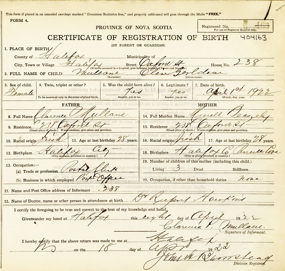 21. Name and Post Office address of Informant Clarence Pl. Mullane 238 Oxford St., Halifax