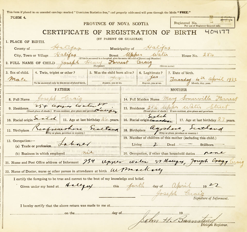 21. Name and Post Office address of Informant Joseph Craig 254 Upper Water St., Halifax
