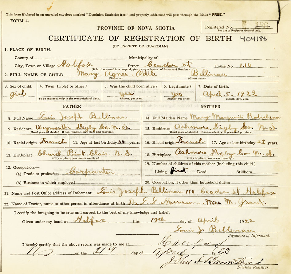 21. Name and Post Office address of Informant Louis Joseph Belliveau 110 Cedar St., Halifax