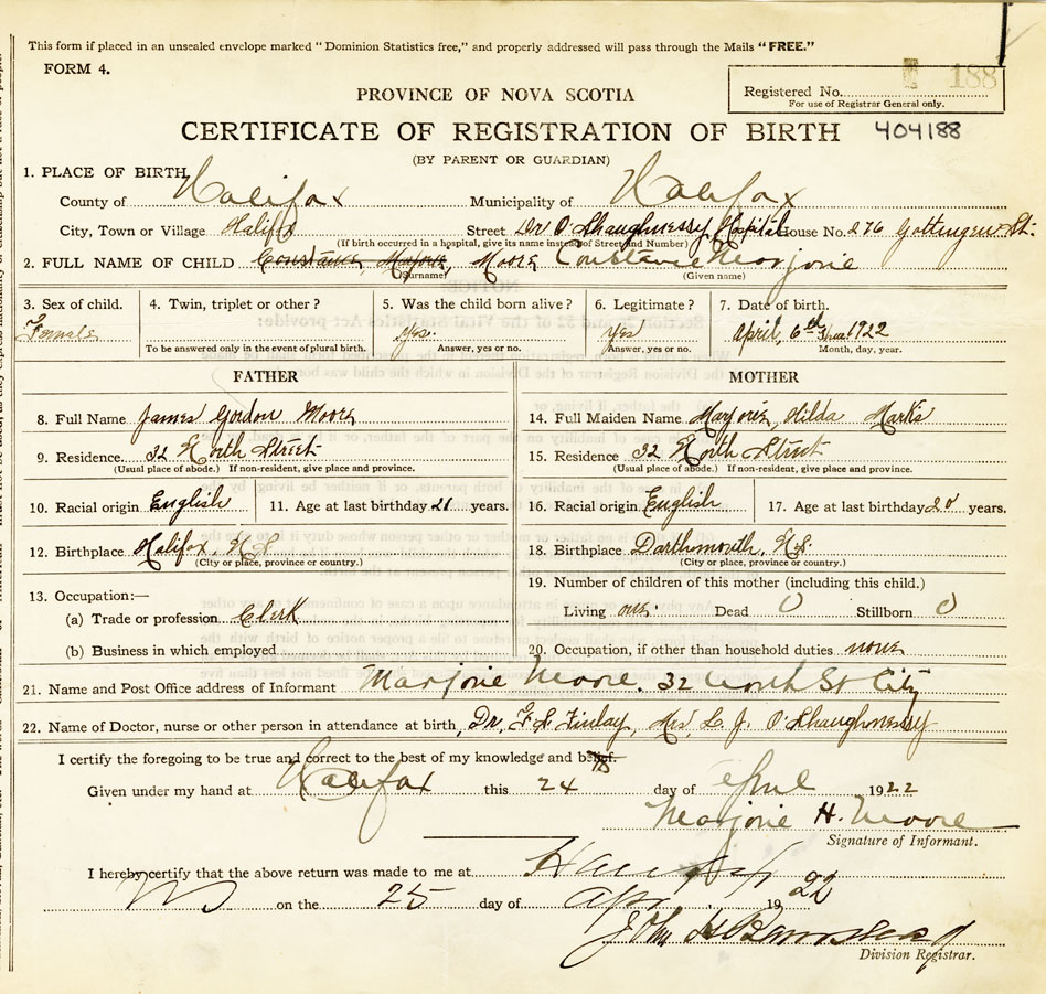 21. Name and Post Office address of Informant Marjorie Moore 32 North St, Halifax