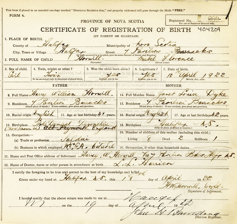 21. Name and Post Office address of Informant Harry W. Horwill 7 Pavilion Barracks, Halifax