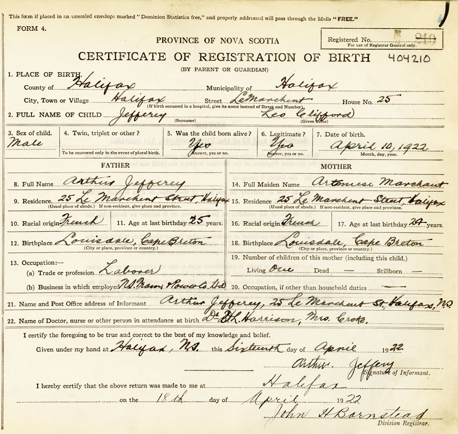 21. Name and Post Office address of Informant Arthur Jefferey 25 Le Marchent Street, Halifax