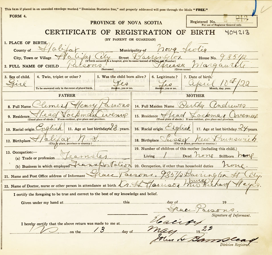 21. Name and Post Office address of Informant Grace Parsons 935½ Barrington St., Halifax