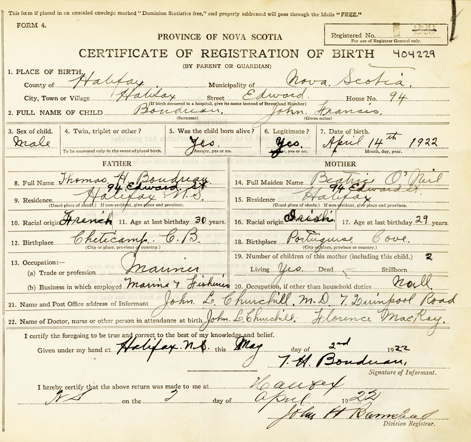 21. Name and Post Office address of Informant T. H. Boudreau 94 Edward St., Halifax