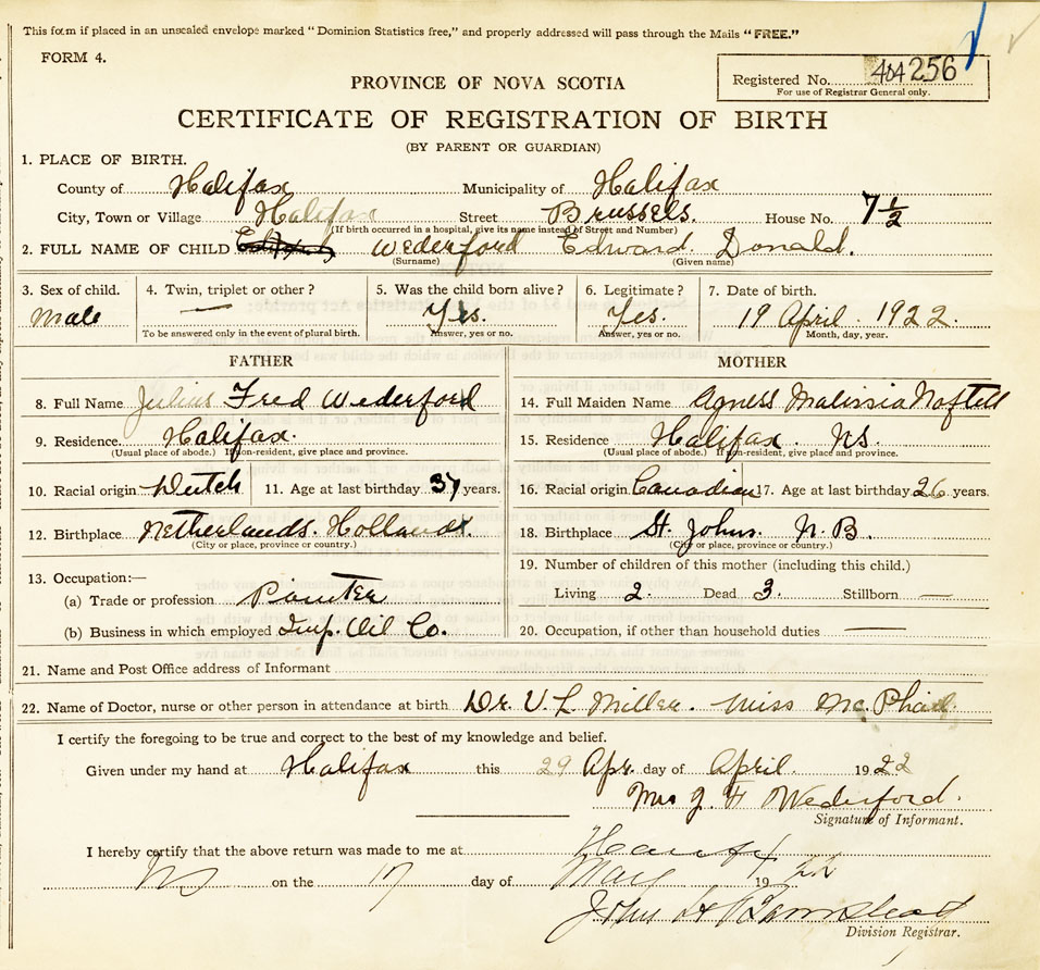 21. Name and Post Office address of Informant Mrs. J.F. Wederford Halifax
