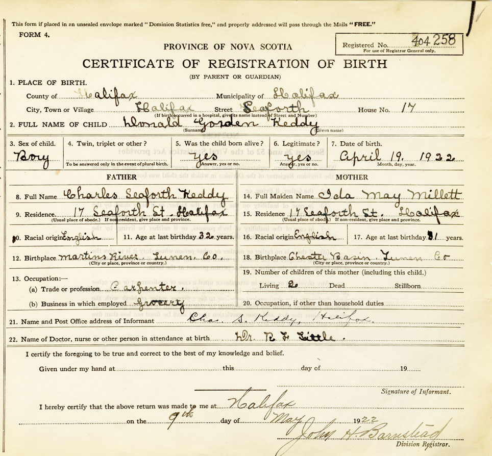 21. Name and Post Office address of Informant Chas. S. Keddy Halifax