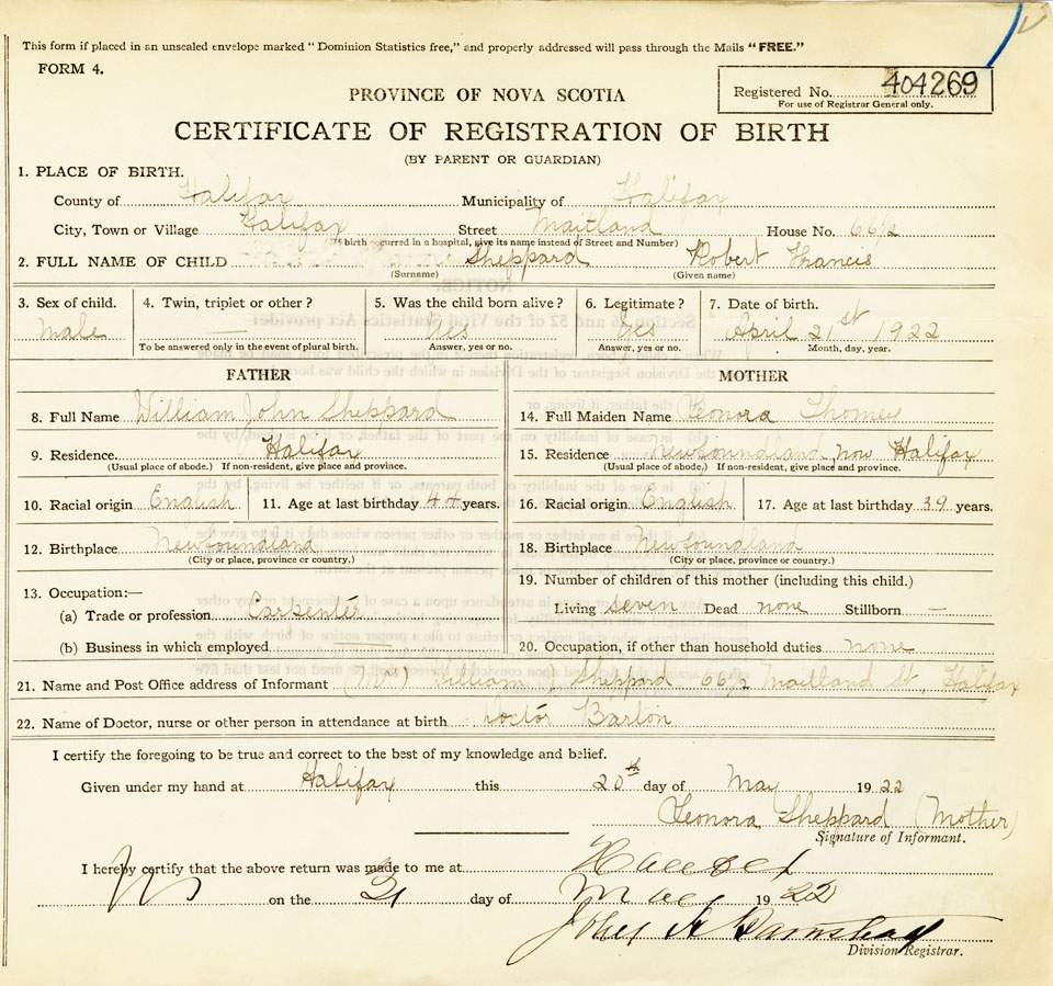 21. Name and Post Office address of Informant Leonora Sheppard 66½ Maitland St., Halifax