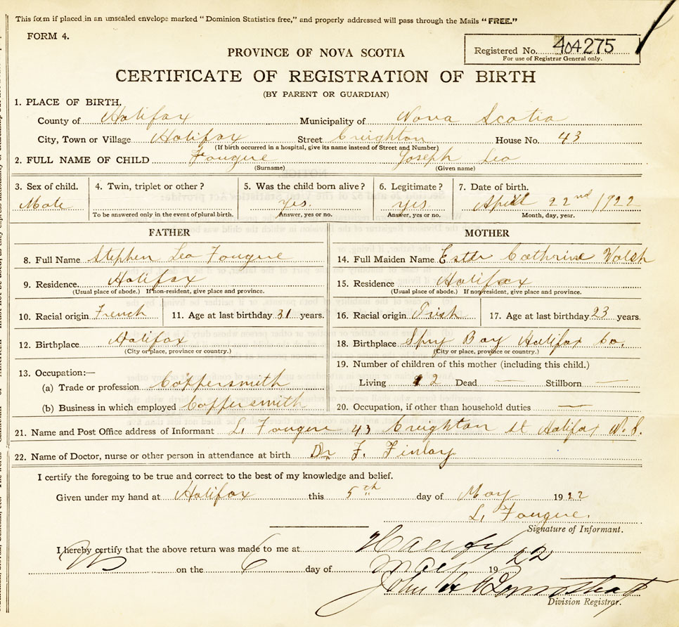 21. Name and Post Office address of Informant L. Fougere 43 Creighton St., Halifax