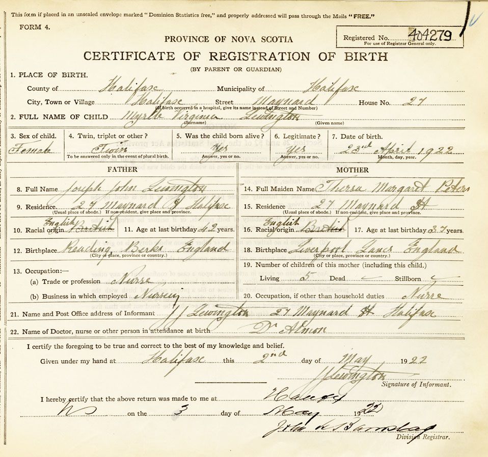 21. Name and Post Office address of Informant J. J. Lewington 27 Maynard St., Halifax