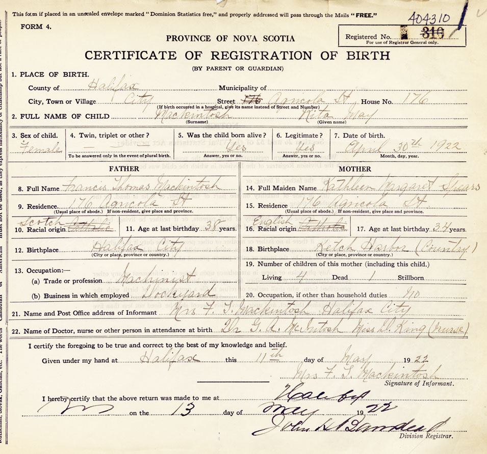 21. Name and Post Office address of Informant Mrs. F. T. Mackintosh Halifax