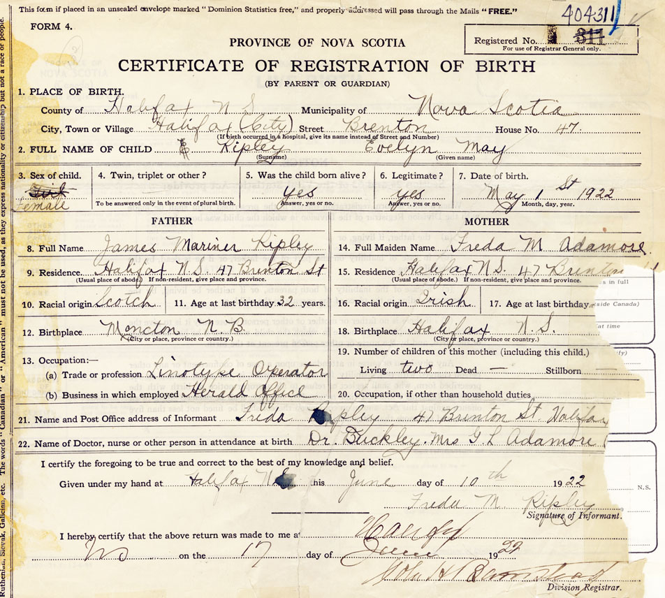 21. Name and Post Office address of Informant Freda Ripley 47 Brenton St., Halifax