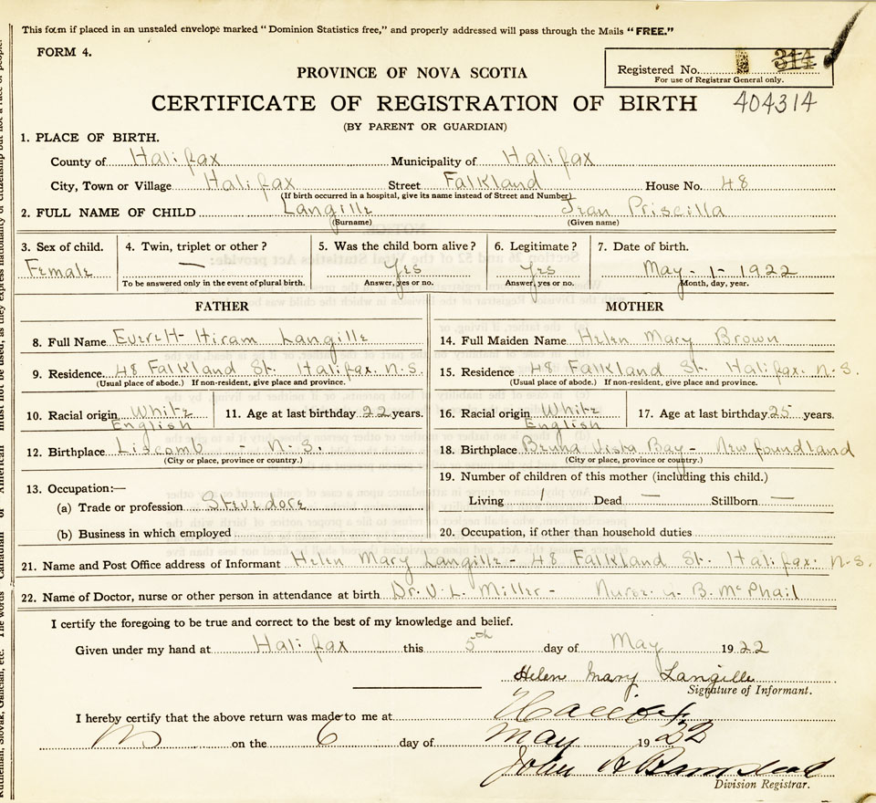 21. Name and Post Office address of Informant Helen Mary Langille 48 Falkland St., Halifax