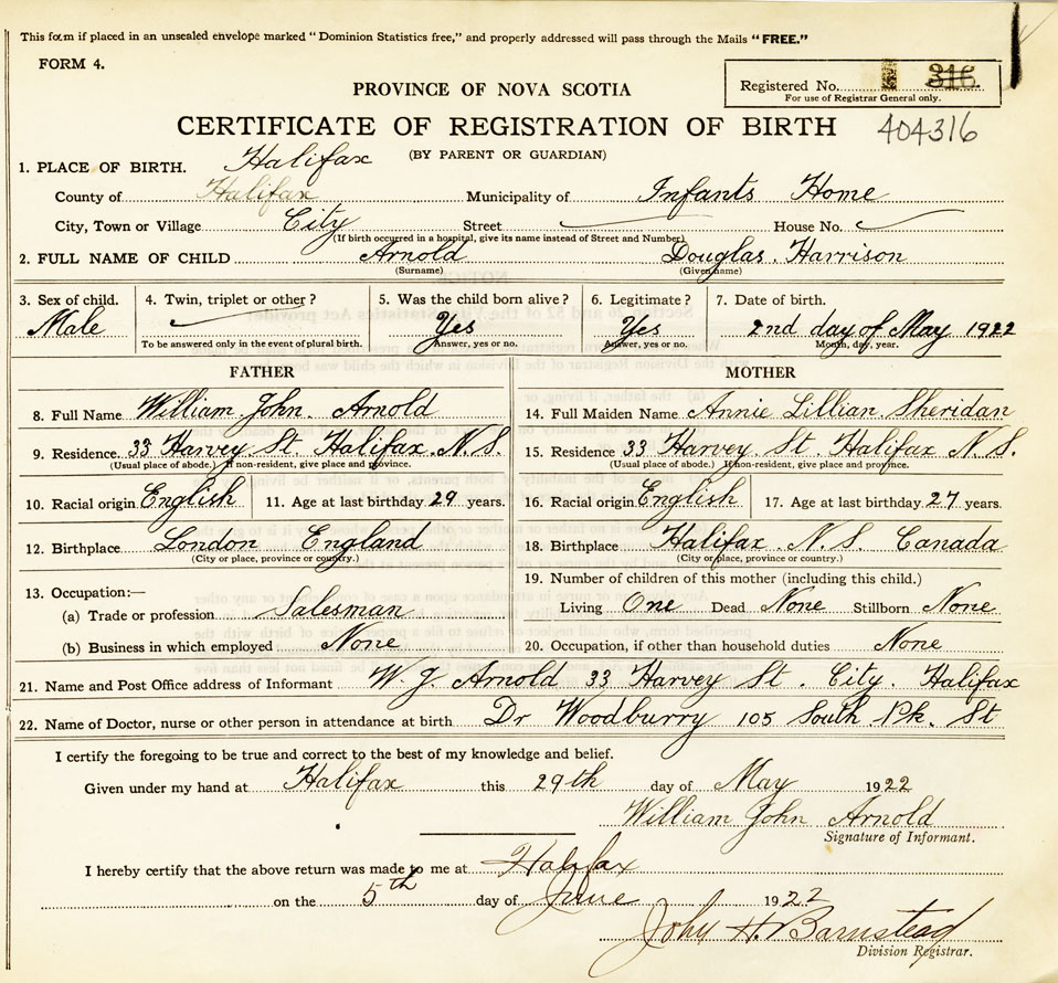 21. Name and Post Office address of Informant W. J. Arnold 33 Harvey St., Halifax