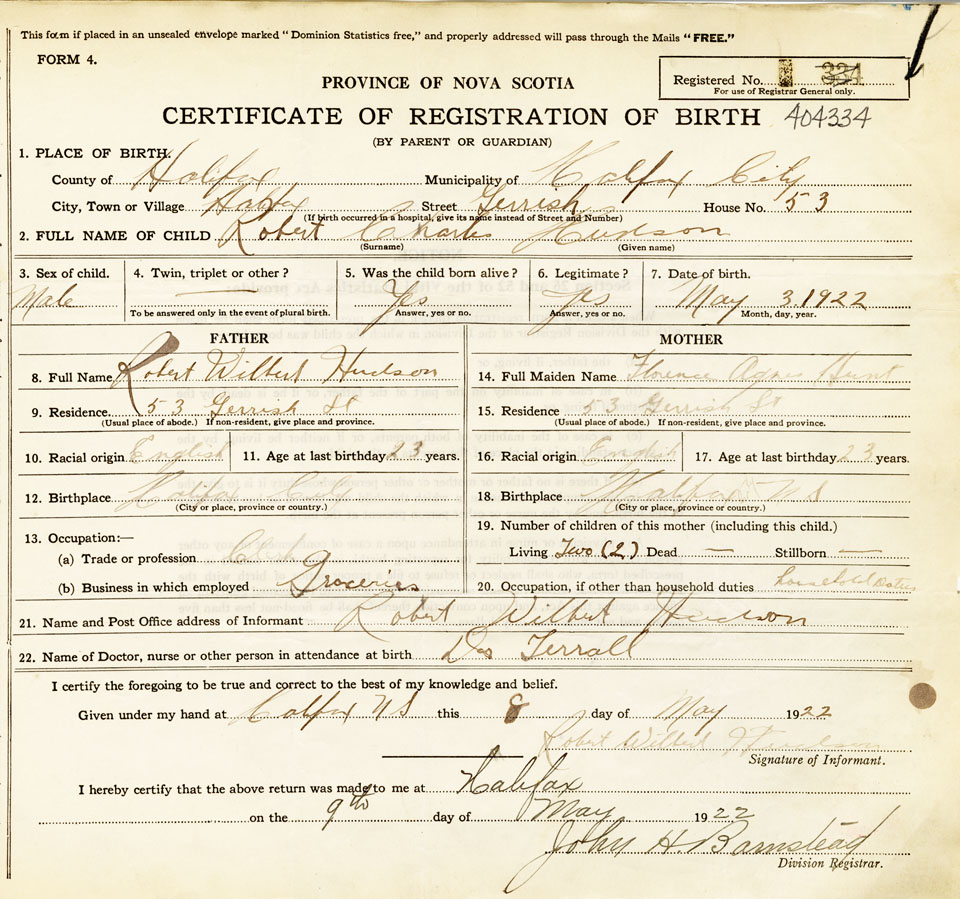 21. Name and Post Office address of Informant Robert Wilbert Hudson 53 Gerrish St., Halifax