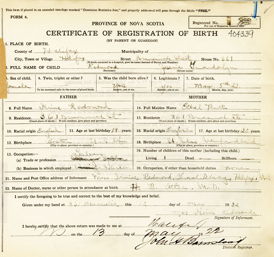 21. Name and Post Office address of Informant Mrs. Irvine Redmond General Delivery, Halifax