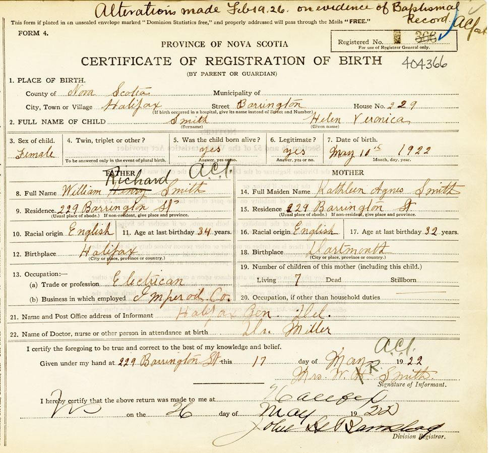 21. Name and Post Office address of Informant Mrs. W. R. Smith Halifax General Delivery