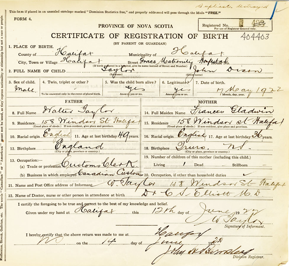 21. Name and Post Office address of Informant W. Taylor 158 Windsor St., Halifax