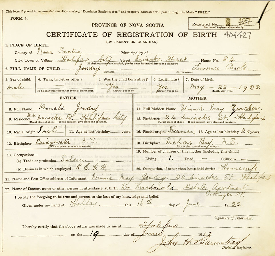 21. Name and Post Office address of Informant Minnie May Joudry 24 Uniacke Street, Halifax,
