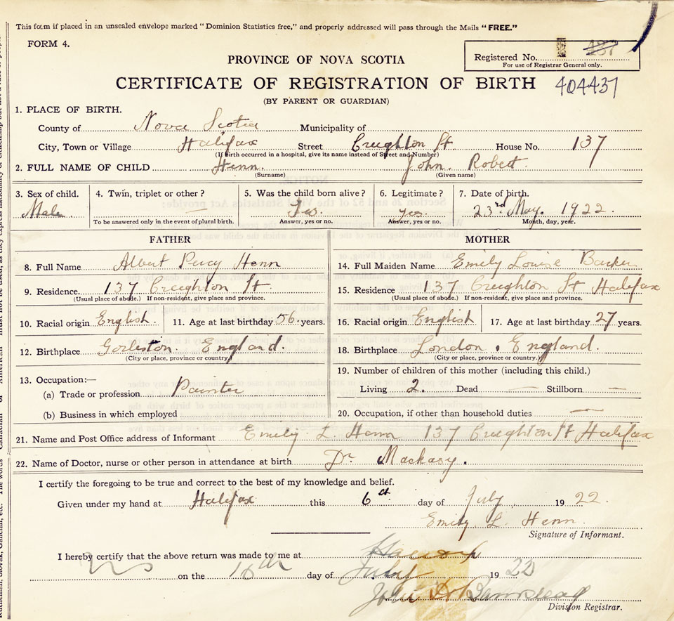 21. Name and Post Office address of Informant Emily L. Henn 137 Creighton St. Halifax