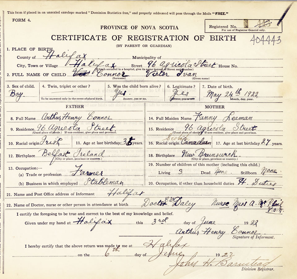 21. Name and Post Office address of Informant Arthur Henry Connor Halifax