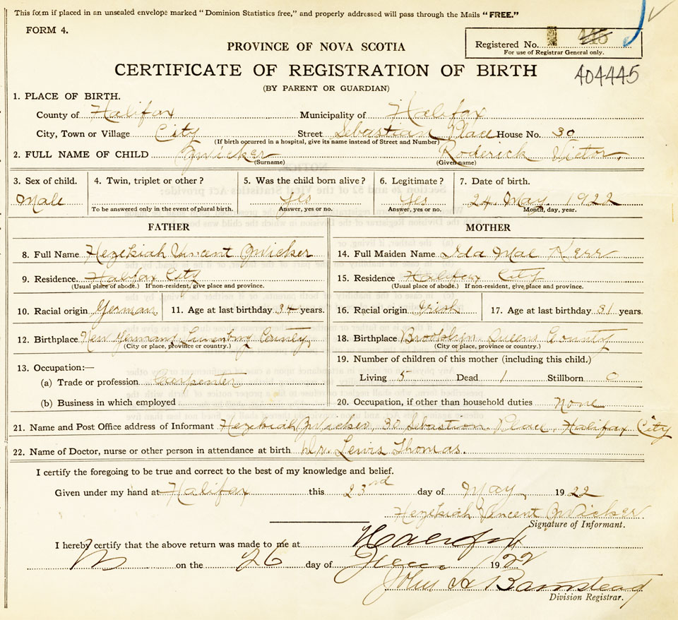 21. Name and Post Office address of Informant Hezekiah Zwicker 30 Sebastian Place, Halifax City