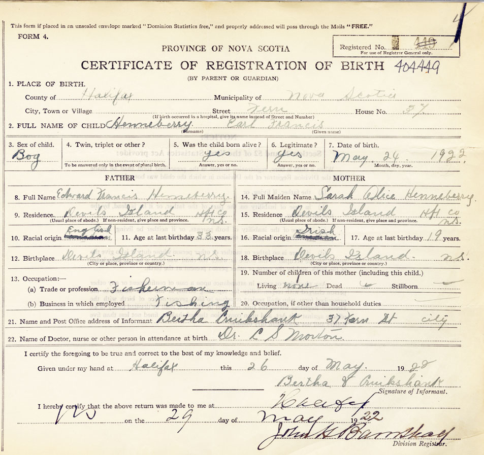 21. Name and Post Office address of Informant Bertha Cruikshank 37 Fern St., Halifax
