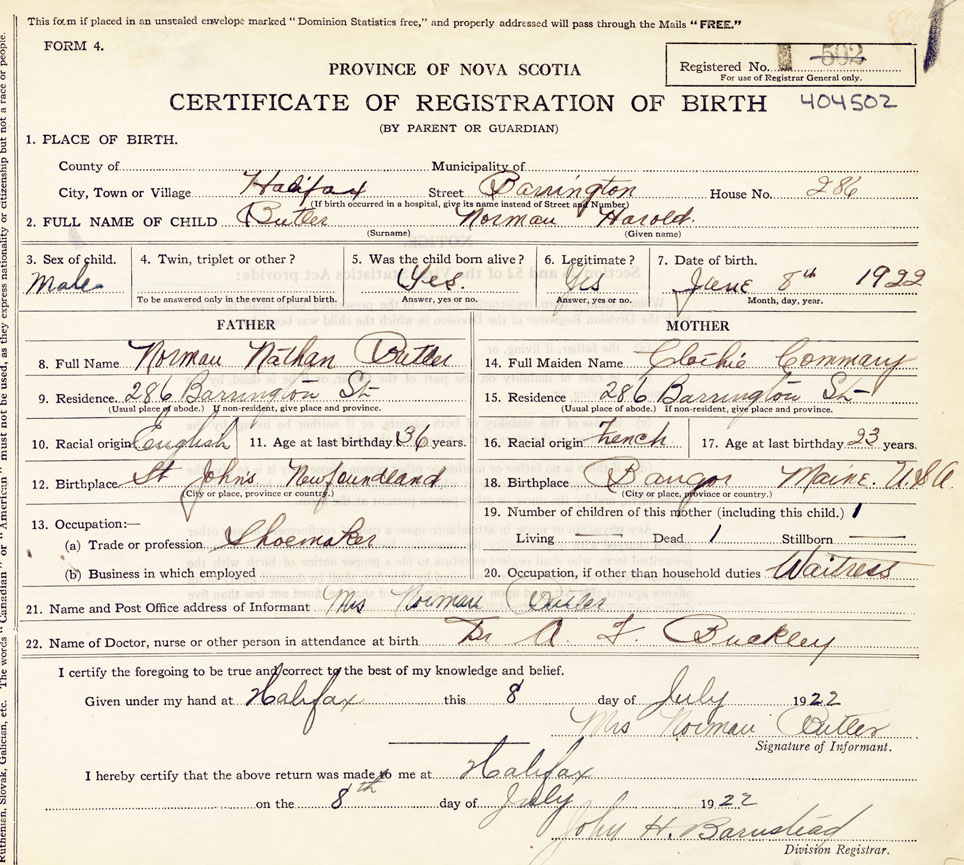 21. Name and Post Office address of Informant Mrs. Norman Butler 286 Barrington St.
