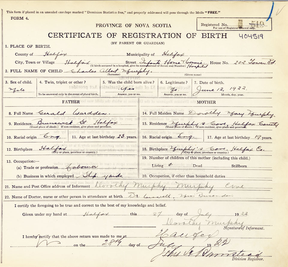 18. Birthplace Murphys Cove, Halifax