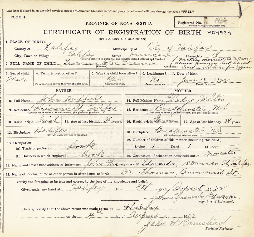 21. Name and Post Office address of Informant John Francis Edwards 18 Duncan St., Halifax