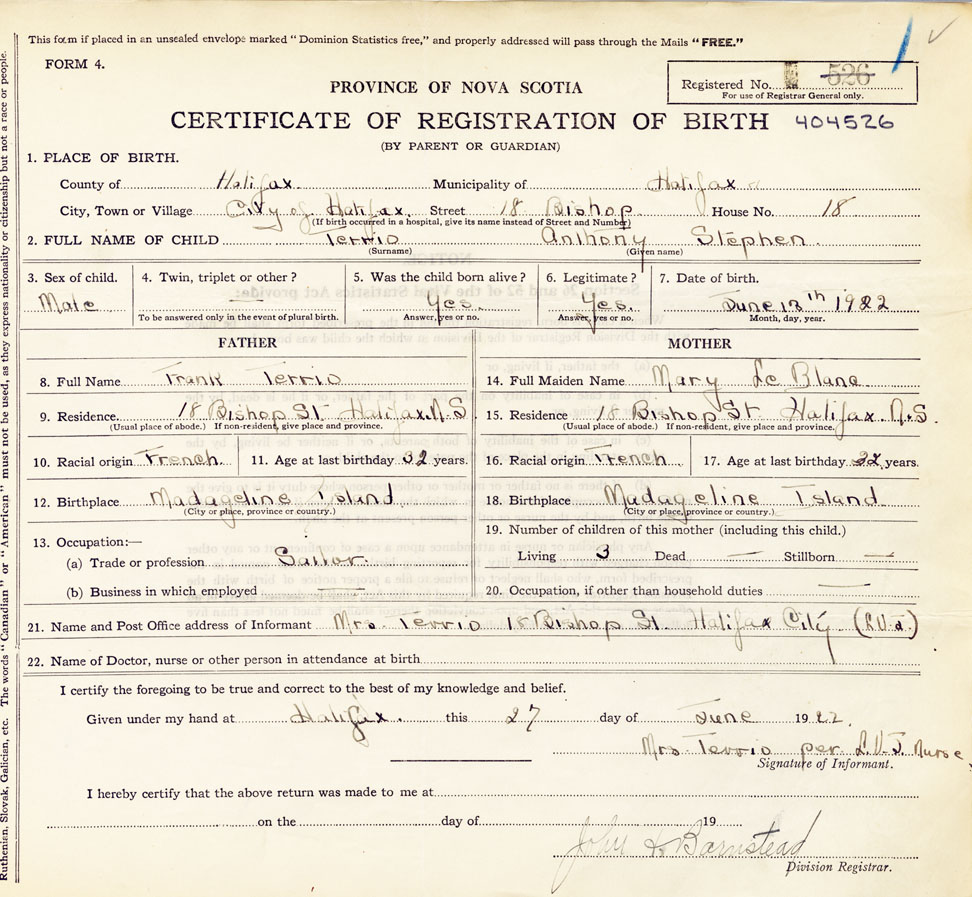 21. Name and Post Office address of Informant Mrs. Terrio 18 Bishop St., Halifax City (L.V.J. Nurse)
