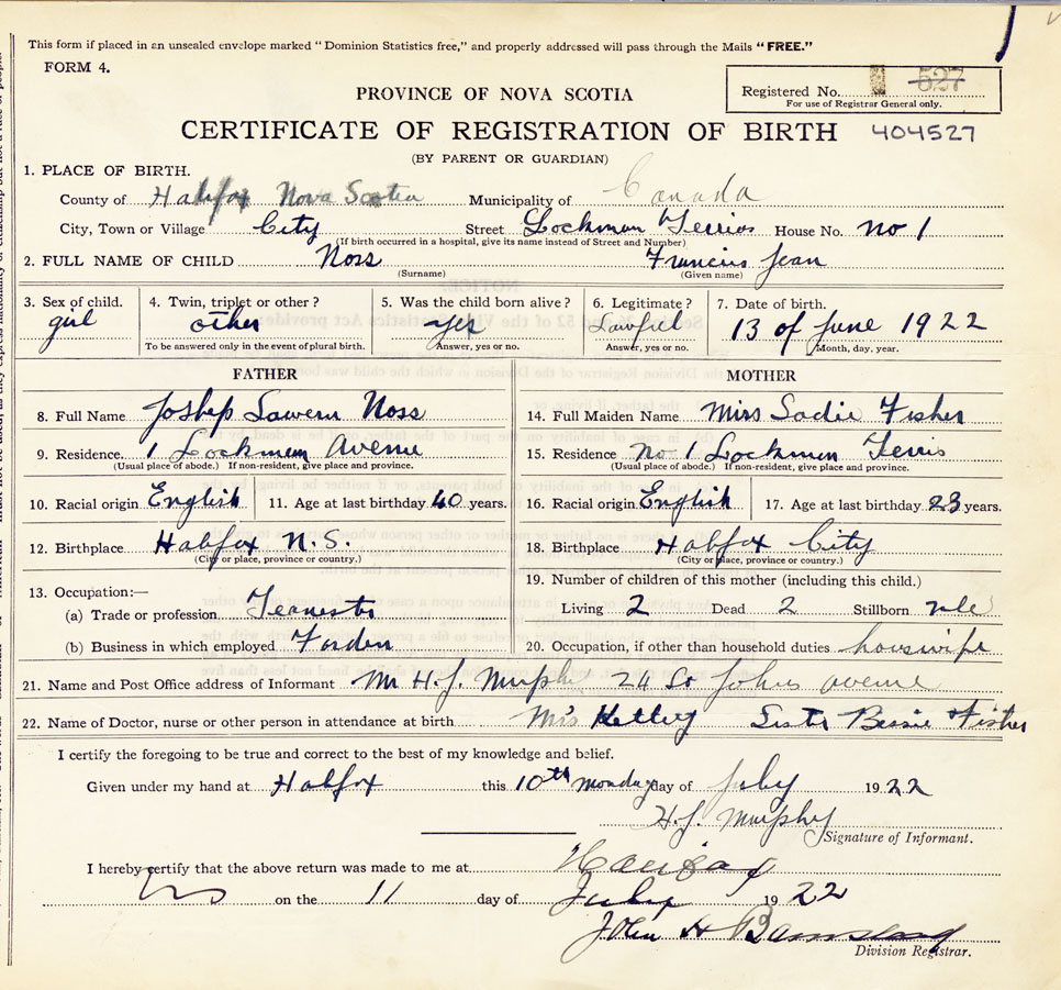 21. Name and Post Office address of Informant Mr. H.F. Murphy 24 St. Johns Ave. Halifax