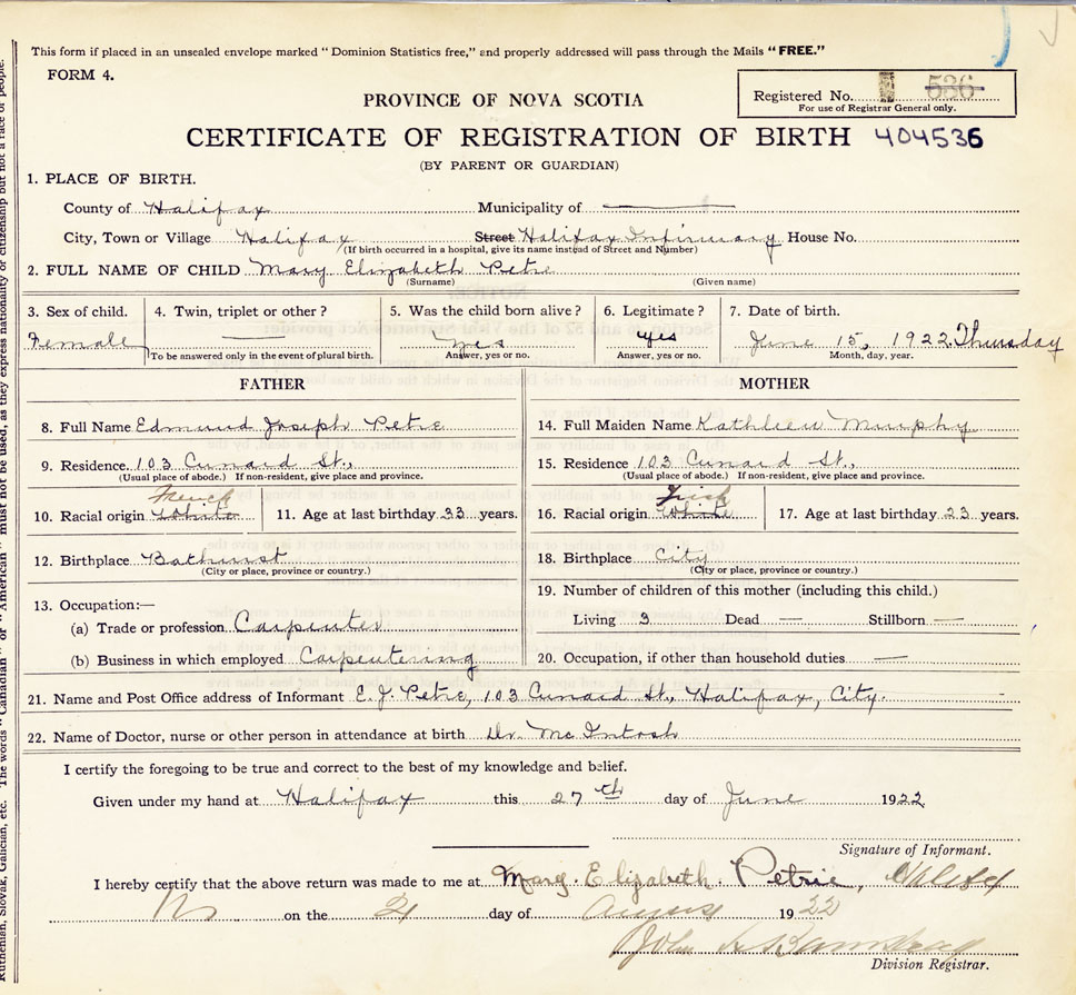 21. Name and Post Office address of Informant E. J. Petre 103 Cunard St., Halifax, City