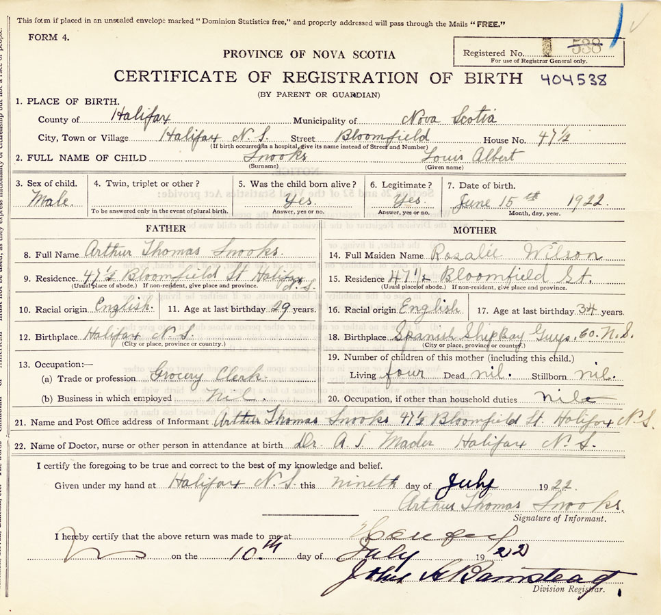 21. Name and Post Office address of Informant Arthur Thomas Snooks 47½ Bloomfield St., Halifax