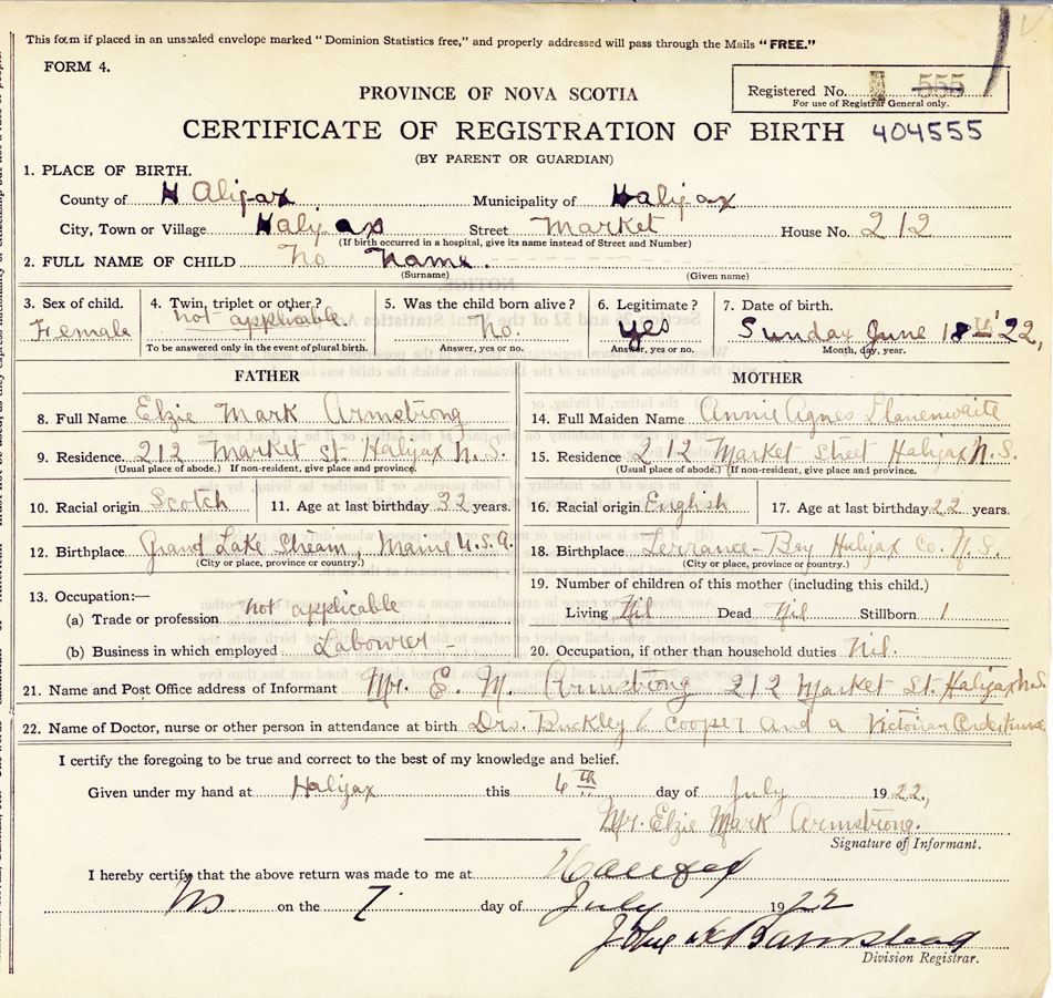21. Name and Post Office address of Informant Mrs. E. M. Armstrong 212 Market Street, Halifax