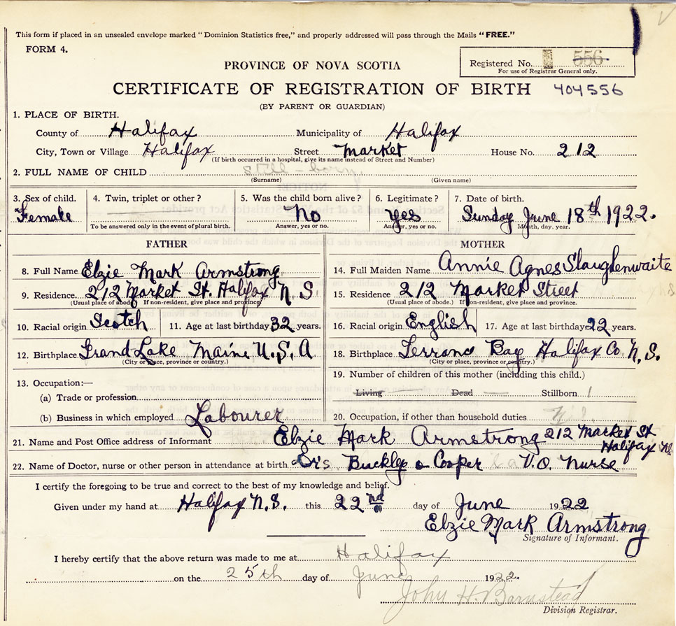 21. Name and Post Office address of Informant Elzie Mark Armstrong 212 Market St. Halifax N.S.