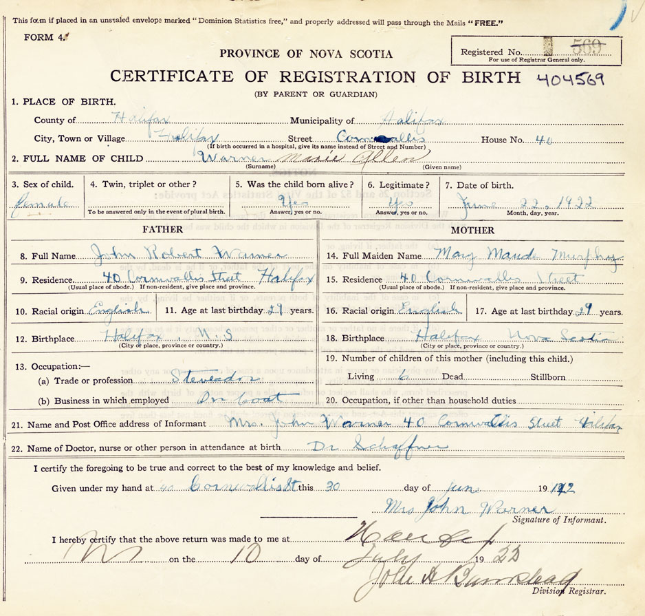 21. Name and Post Office address of Informant Mrs. John Warner 40 Cornwallis Street, Halifax