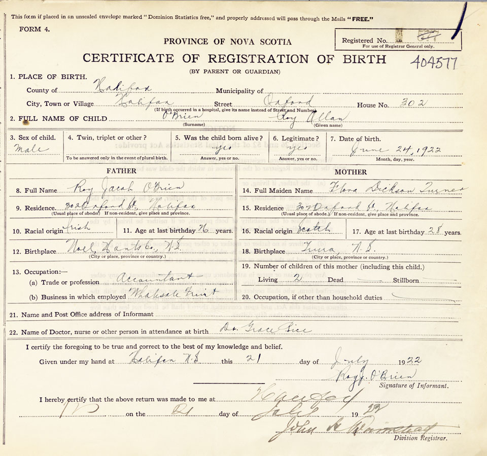 21. Name and Post Office address of Informant Roy J. O'Brien 302 Oxford St., Halifax
