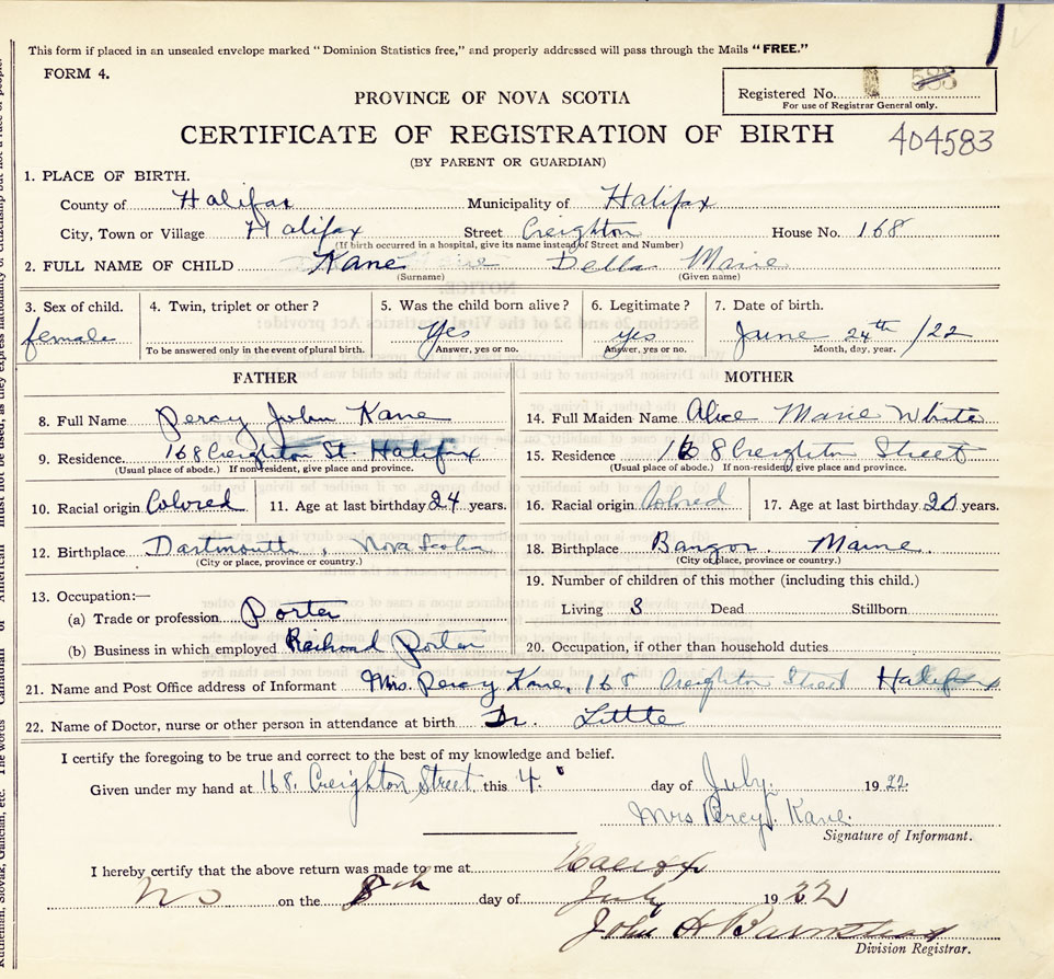 21. Name and Post Office address of Informant Mrs. Percy Kane 168 Creighton Street, Halifax