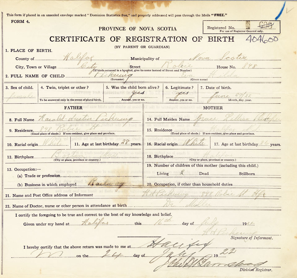 21. Name and Post Office address of Informant H.A. Pickering 848 Robie St. Halifax