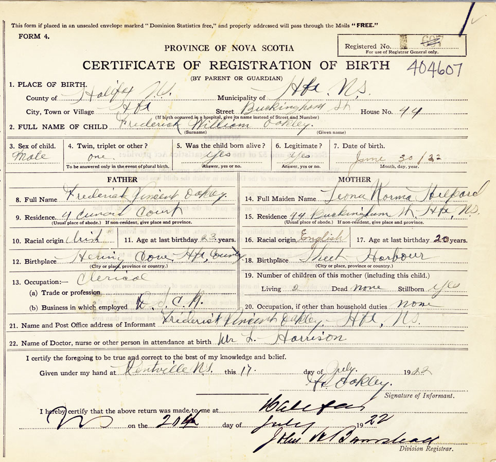21. Name and Post Office address of Informant Frederick Vincent Oakley Halifax, N.S