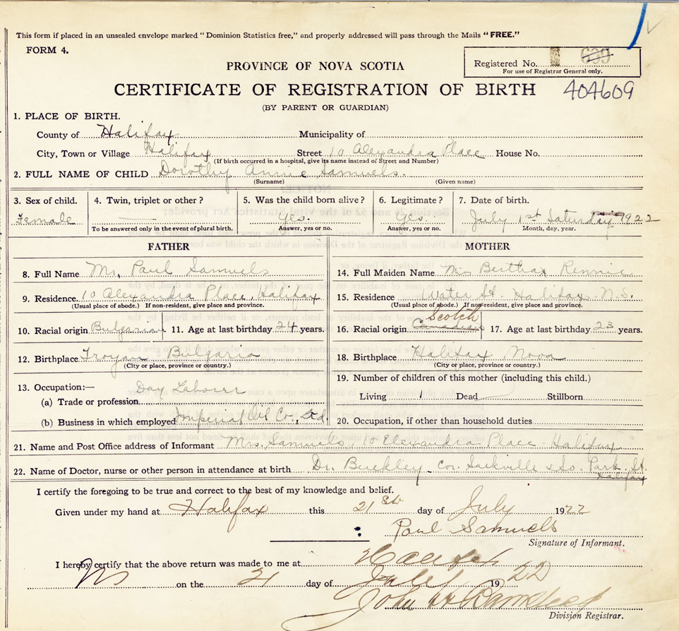 21. Name and Post Office address of Informant Mrs. Samuels 10 Alexandra Place, Halifax