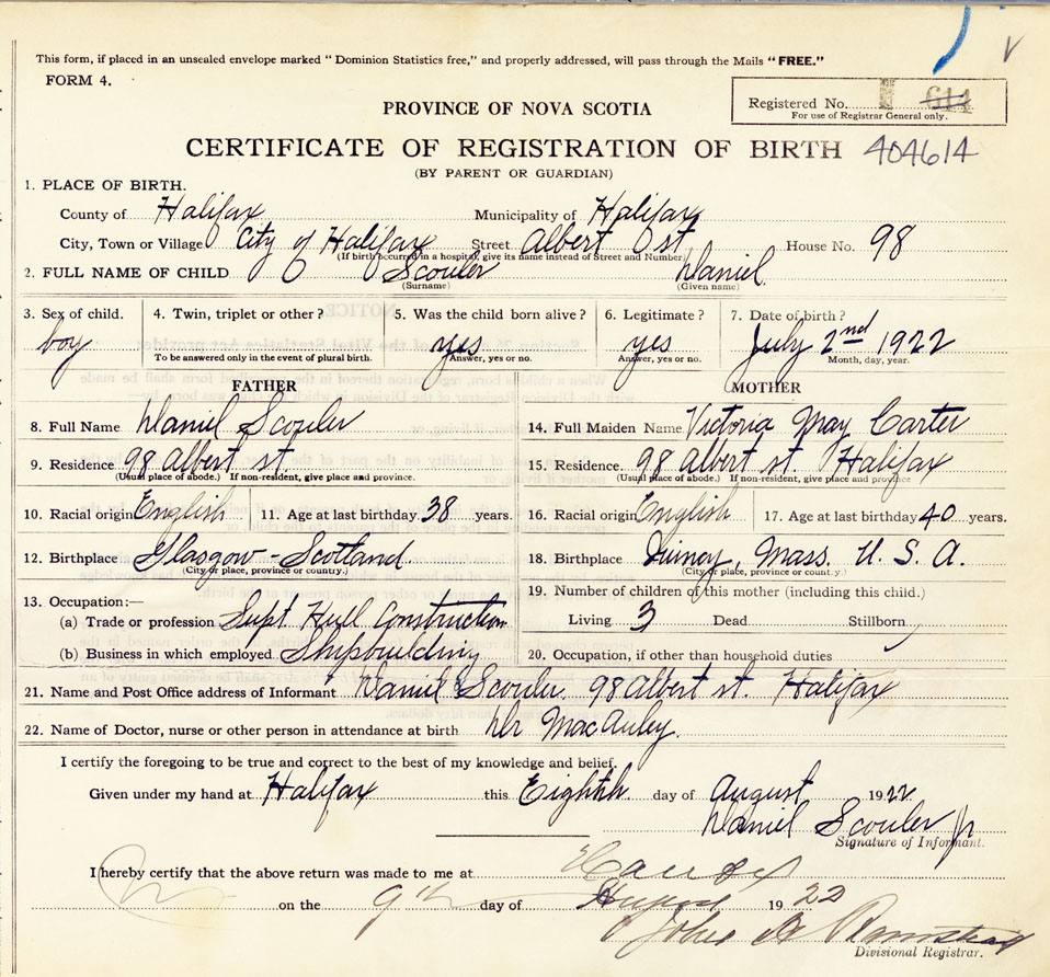 21. Name and Post Office address of Informant Daniel Scouler 98 Albert St., Halifax,