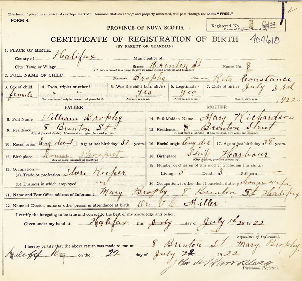 21. Name and Post Office address of Informant Mary Brophy 8 Brenton Street, Halifax