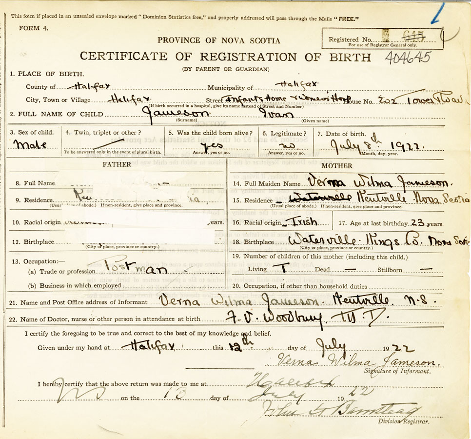 21. Name and Post Office address of Informant Verna Wilma Jameson Kentville