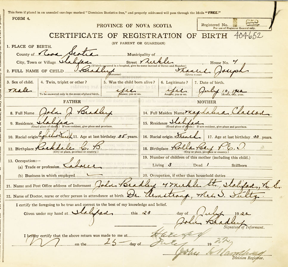 21. Name and Post Office address of Informant John Bradley 4 Meckle St. Halifax